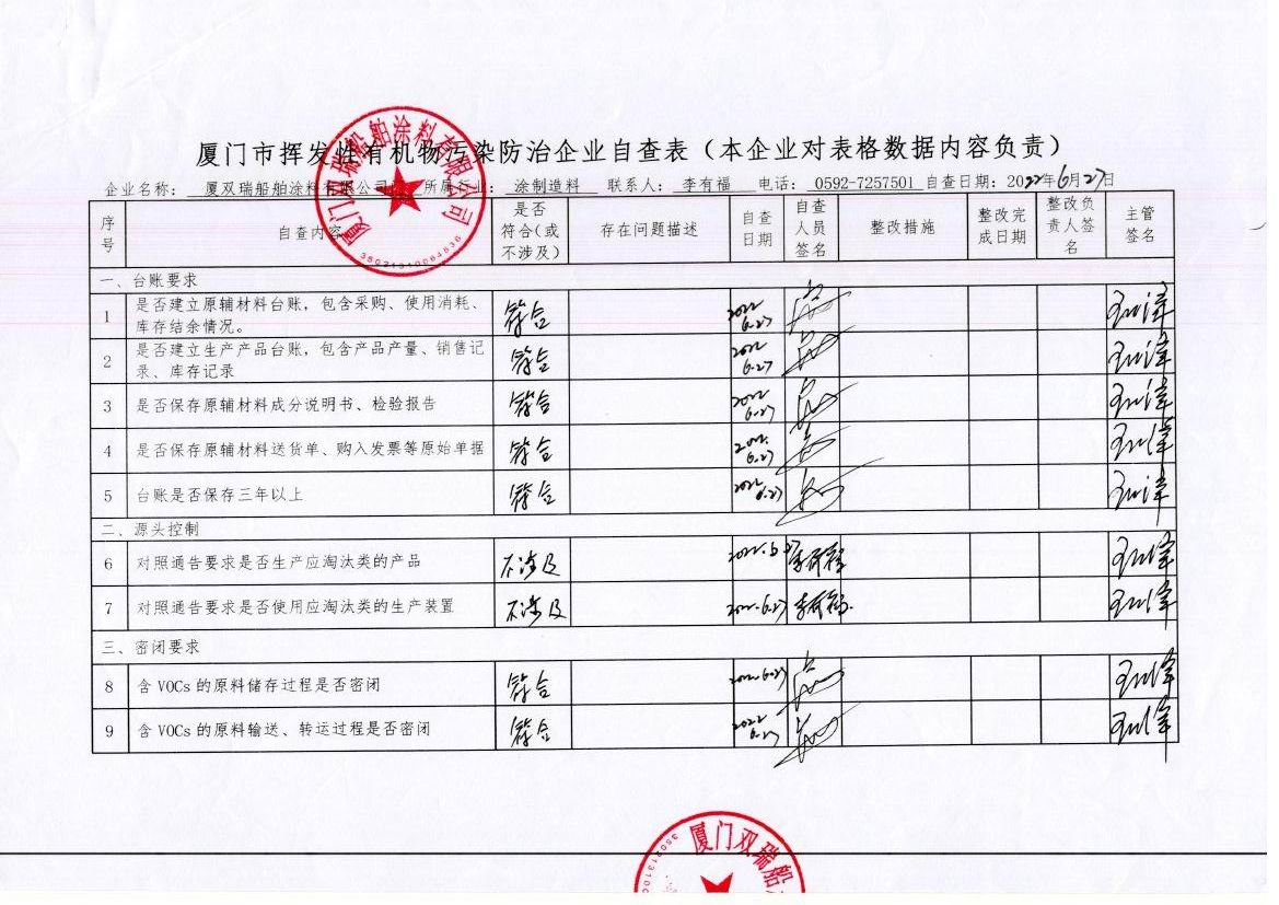 | 揮發(fā)性有機(jī)物污染防治企業(yè)自查表2022年2第季(廈門雙瑞船舶涂料有限公司) |